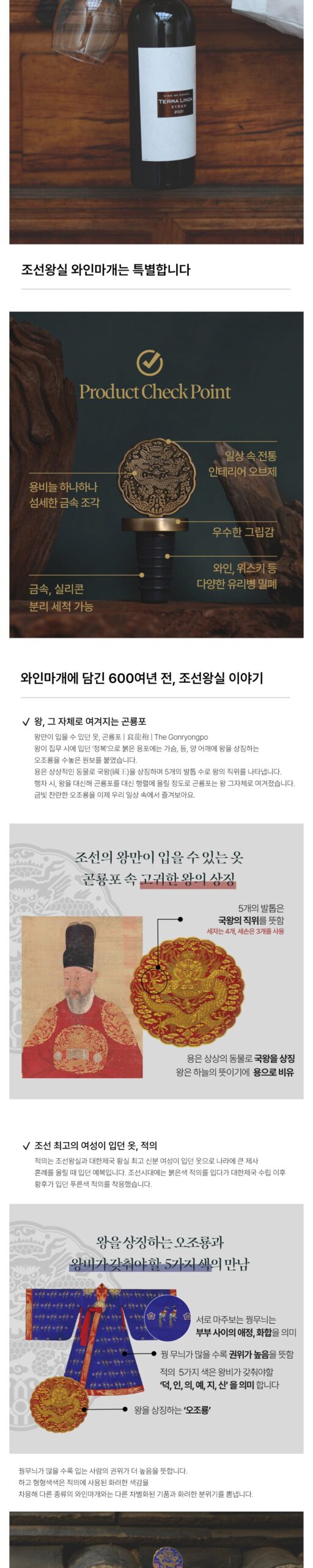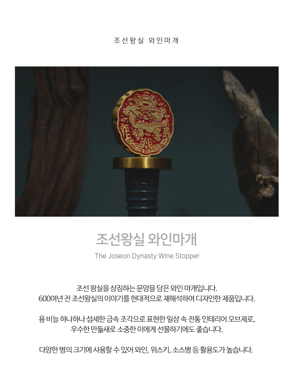 Dragon Robe Motif: Once reserved only for kings, the intricate dragon scale pattern on this wine stopper reflects the regal power and dignity of the Joseon Dynasty.