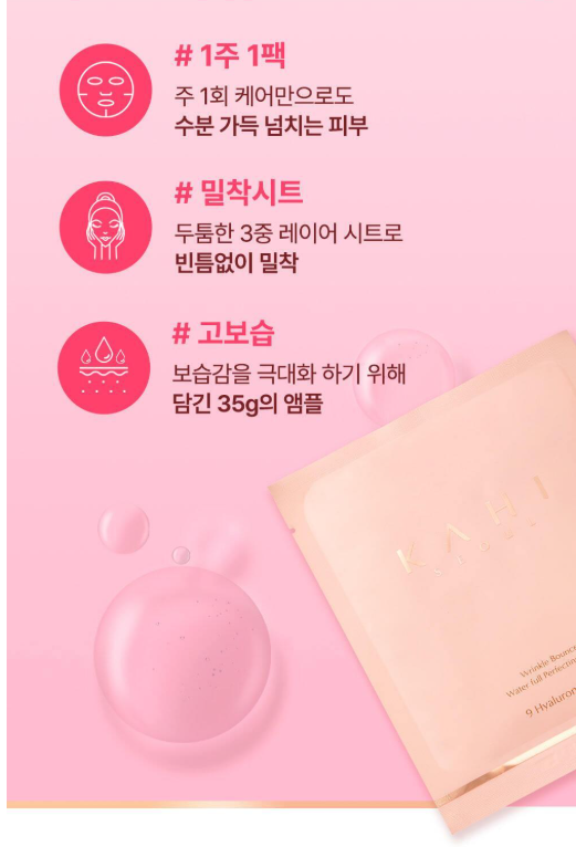 The KAHI Wrinkle Bounce Water Full Perfecting Mask contains 35g of highly-concentrated essence for intensive elasticity and moisture care. Infused with Salmon Complex, which increases the synthesis of collagen to restore skin elasticity effectively, while 9 kinds of Hyaluronic Acid form a moisture barrier which helps prevent the moisture loss of skin. Made with 100% pure cotton sheet which highly adheres on the face to optimise the absorption of active ingredients into your skin.