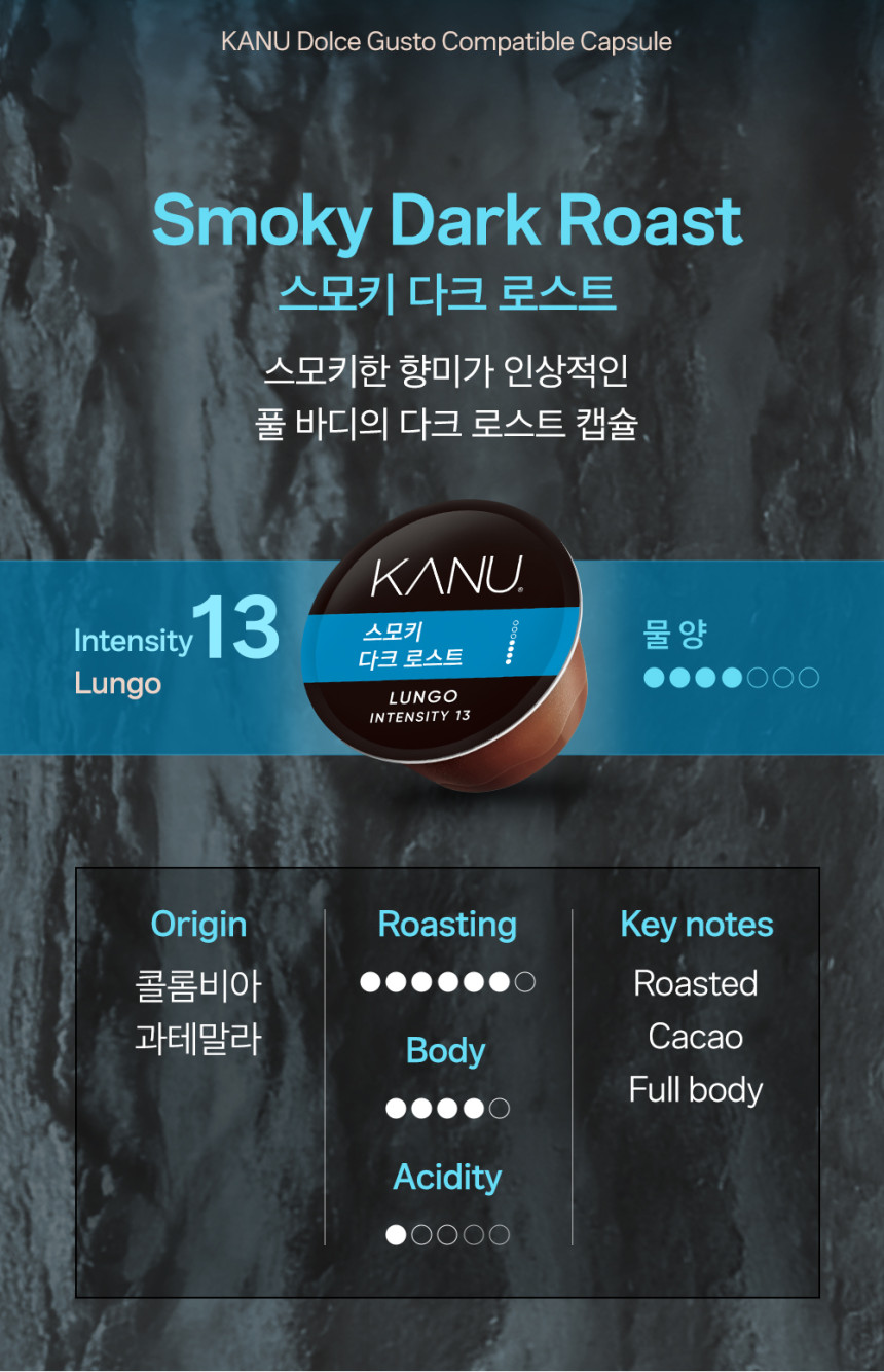 Ignite your senses with the KANU Smoky Dark Roast, a powerful and distinctive coffee experience crafted for true connoisseurs. These premium capsules are perfectly compatible with your Nescafé Dolce Gusto machine, delivering an intensely bold cup with an unparalleled depth of flavor. Prepare for a rich, full-bodied coffee featuring prominent roasted notes, hints of cocoa, and a unique, captivating smoky finish that sets it apart.