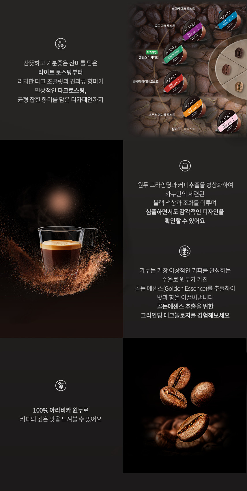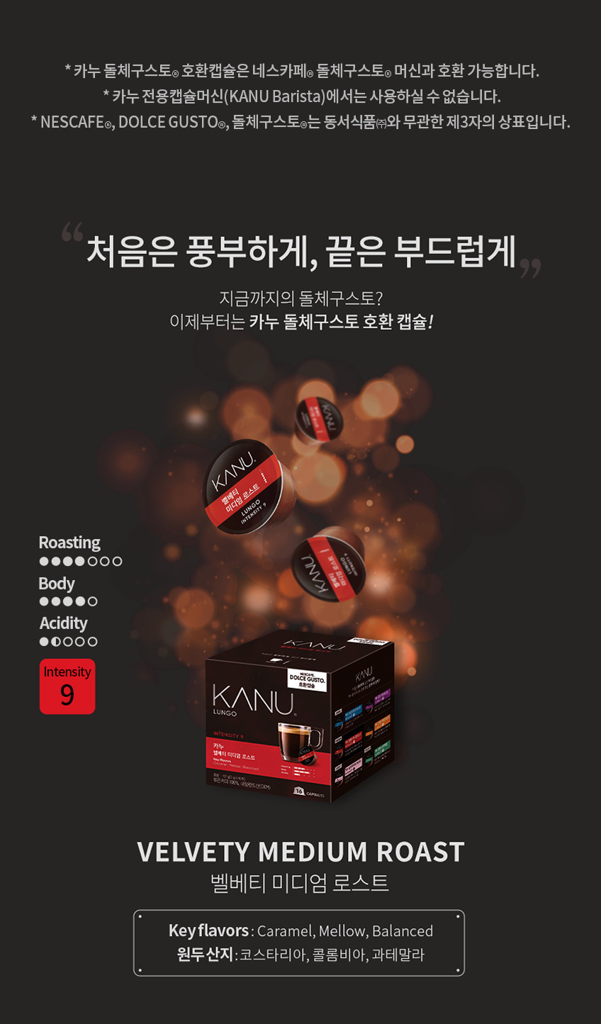 KANU Velvety Medium Roast is a premium coffee capsule compatible with Dolce Gusto machines. Bringing the beloved KANU taste to capsule coffee lovers, this medium roast delivers a smooth, velvety flavor with balanced acidity and rich aroma. Made with carefully selected beans and over 50 years of Dongsuh Foods coffee expertise.