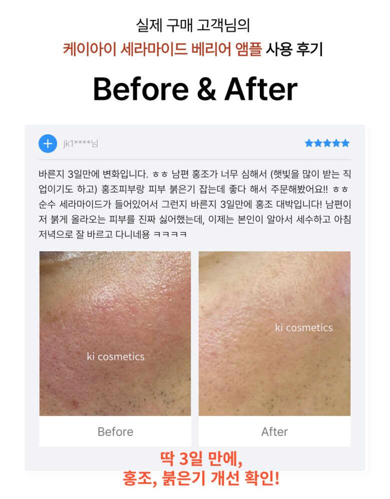 After using the ki cosmetics Ceramide Barrier Ampoule for a week, I am truly impressed. The concentrated formula contains 2,000ppm of ceramides which worked wonders on my sensitive skin. It significantly reduced redness and improved overall hydration within just three days. The texture is light and absorbs quickly without leaving any greasy residue, making it perfect for daytime use under makeup. I’ve also noticed that my skin feels more resilient against external irritants since starting this product.