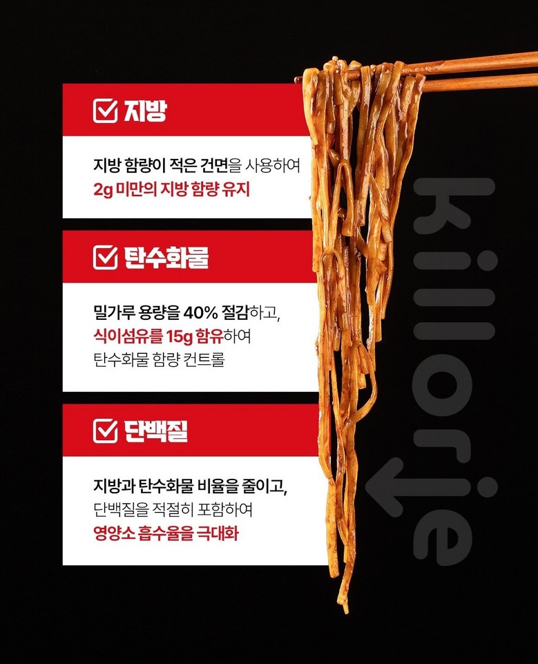 A delicious low-calorie, low-sugar diet jajangmyeon (Korean black bean sauce noodles) perfect for weight management. This innovative product combines the satisfying taste of traditional jajangmyeon with health-conscious ingredients.