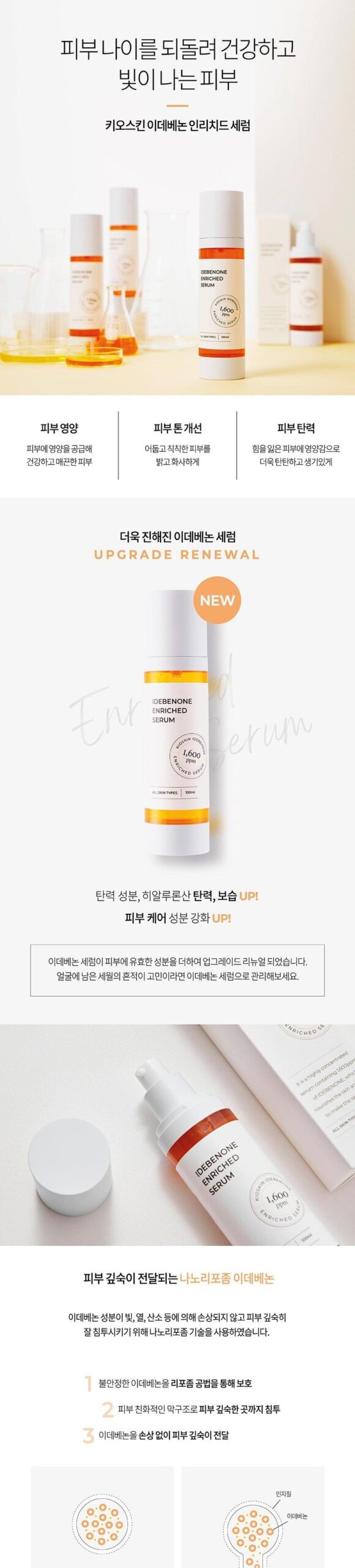 Nanoliposome technology was used to allow the idebenone ingredient to penetrate deep into the skin without being damaged by light, heat, oxygen, etc.