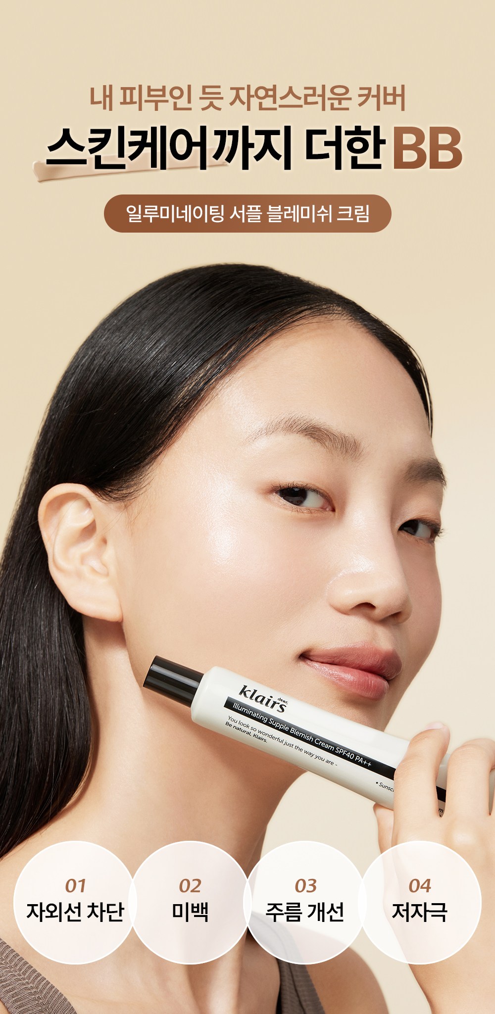 The KLAIRS Illuminating Supple Blemish Cream (BB Cream) is a multi-functional skincare and makeup product that provides coverage, brightens, prevents fine lines and wrinkles. This BB cream gives a natural, translucent finish without any grey cast. It is easily buildable without any cakiness to effectively cover pores and redness. It is upgraded with hyaluronic acid and sebum control powder, which keeps the skin moisturised and soft all day long.