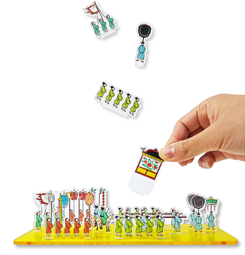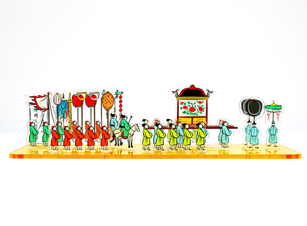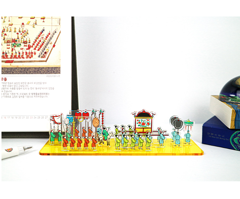 Following the illustrious footsteps of the Joseon royal procession, this exquisite acrylic stand meticulously reconstructs the palanquin and ceremonial guard depicted in the historical document, the “Gyeongjongwang Sejachekrye Dogam Uigwe.”