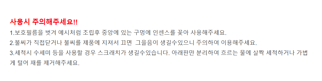 - Exercise caution when using the incense holder, as direct contact with hot embers or placing embers directly onto the product may cause melting, scorching, or other damage to the acrylic material.