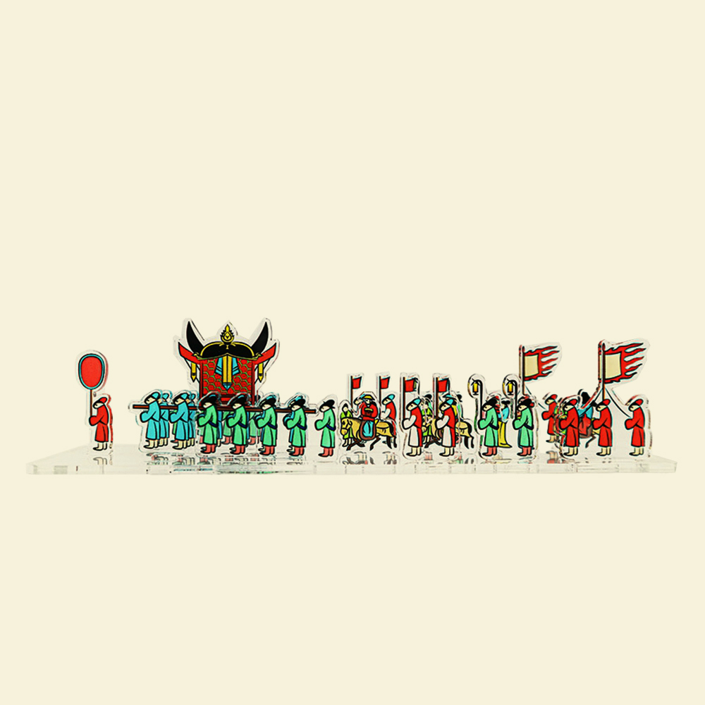 Witness the flat, two-dimensional figures from the ancient Uigwe spring to life in stunning 3D! The meticulously designed honor guard figures from the “Uigwe of King Sukjong & Queen Ingyeong’s Royal Wedding Procession” have been reborn as an engaging, assembly-type acrylic stand. Each character, from the palanquin bearers to the flag carriers, is crafted to slot perfectly into the base, creating a vibrant, three-dimensional tableau.