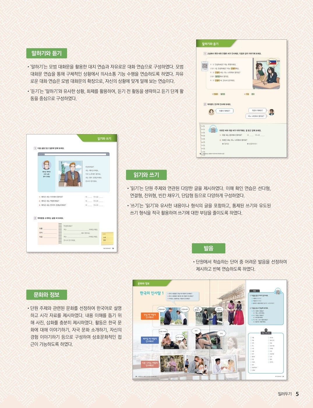 - Culture & Information: Discusses Korean culture related to the unit topics, supported by visual materials and activities for an intercultural approach.