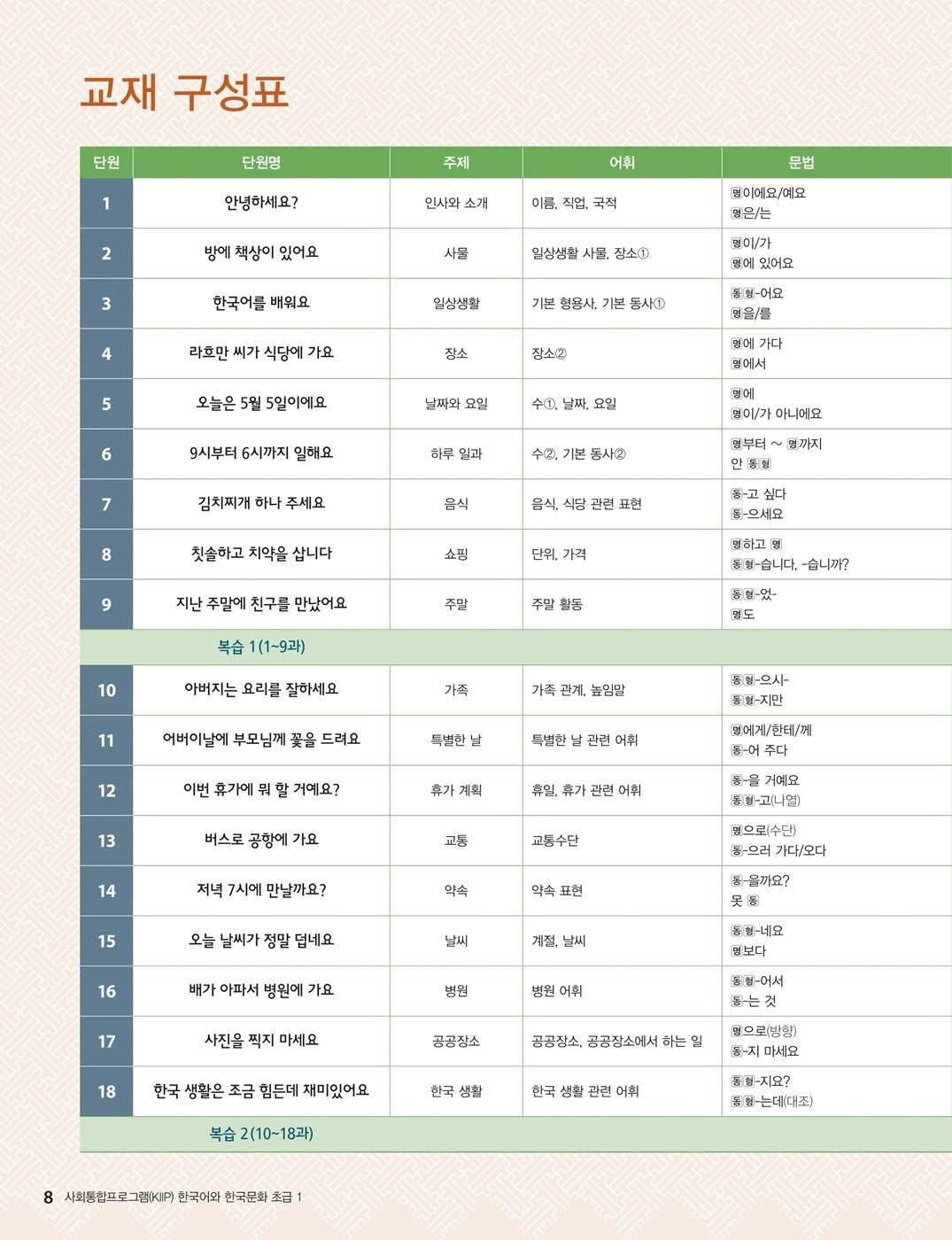 Social Integration Program (KIIP) Korean Language and Culture is a comprehensive textbook designed for the Ministry of Justice’s Social Integration Program. This book is tailored for various immigrants, including married immigrants, workers, professional workers, international students, and children of mid-arrivals. It focuses on helping them integrate into Korean society by providing essential language and cultural knowledge.