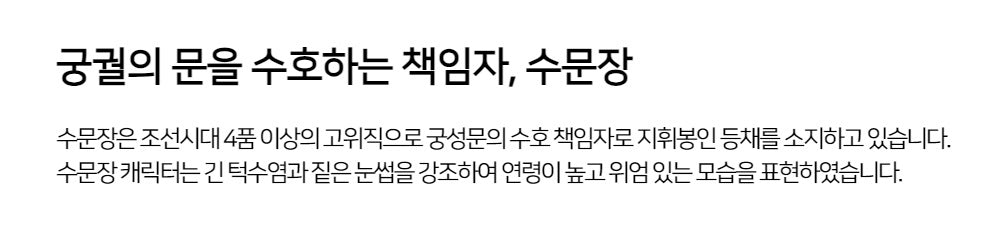 The Suwonjang (Gatekeeper) was a high-ranking official (4th rank or higher) responsible for guarding the palace gates. He carried a royal command baton (Deungchae) as a symbol of authority.