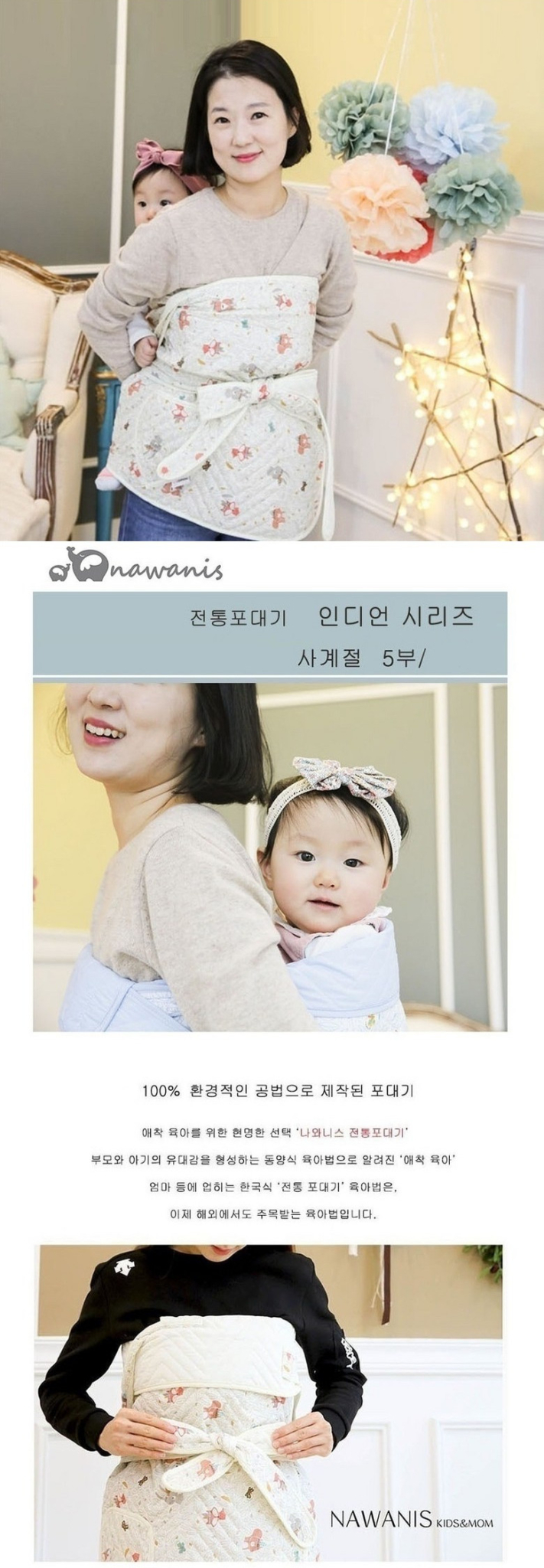 The traditional Korean baby carrier that has been used for generations. This modern version of the classic podaegi combines traditional comfort with contemporary design.