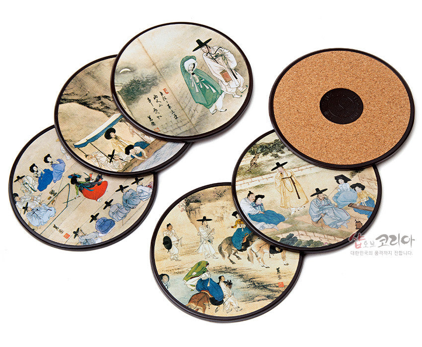 This is a set of six cup coasters featuring folk paintings by the renowned Joseon artist Hye Won Shin Yun Bok, known for his exceptional use of colors.