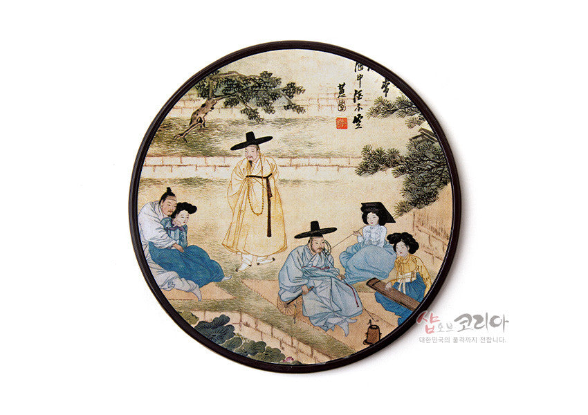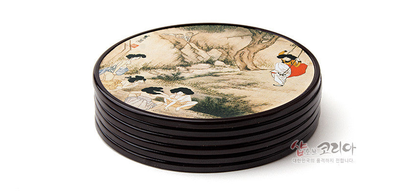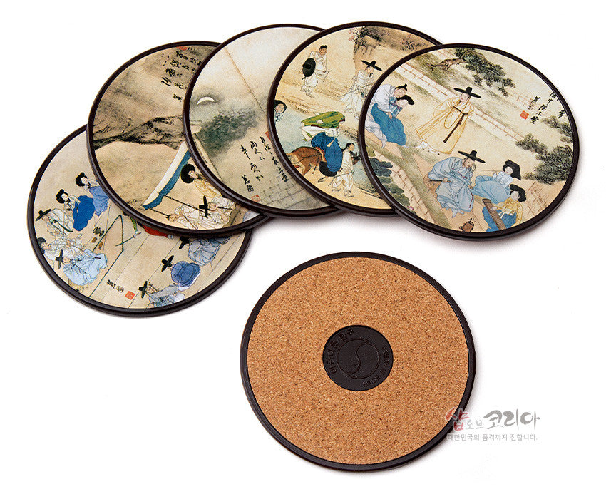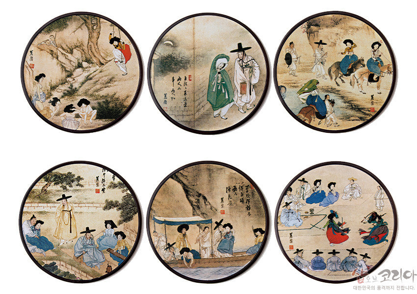 This is a set of six cup coasters featuring folk paintings by the renowned Joseon artist Hye Won Shin Yun Bok, known for his exceptional use of colors.