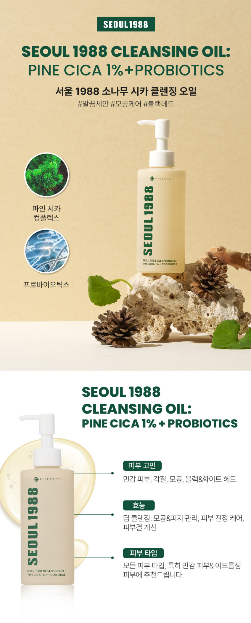The KSECRET SEOUL 1988 Cleansing Oil: Pine Cica 1% + Probiotics is a deep cleansing oil to effectively remove impurities without irritating skin. Contains Pine Cica Complex and Probiotics to soothe irritated skin and provide a moist finish even after cleansing, while 5 types of plant-based oils gently dissolve not only makeup, but also blackheads and whiteheads in pores.