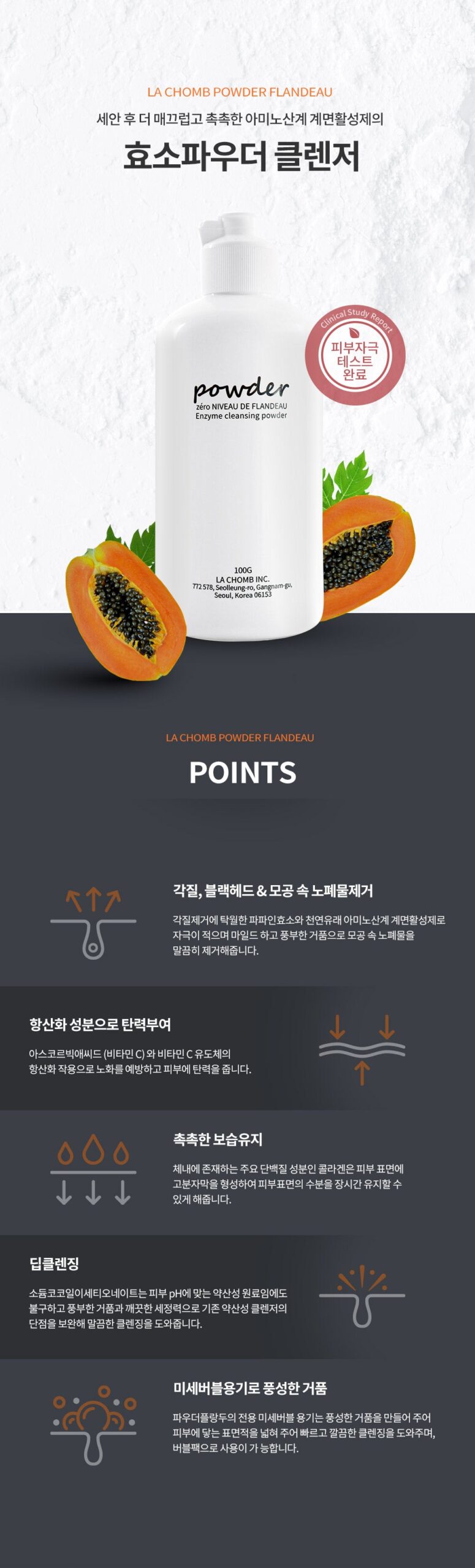 Papain enzyme, which is excellent for exfoliating dead skin cells, and naturally derived amino acid-based surfactants are less stimulated, and the mild and rich foam thoroughly removes wastes in the pores.
