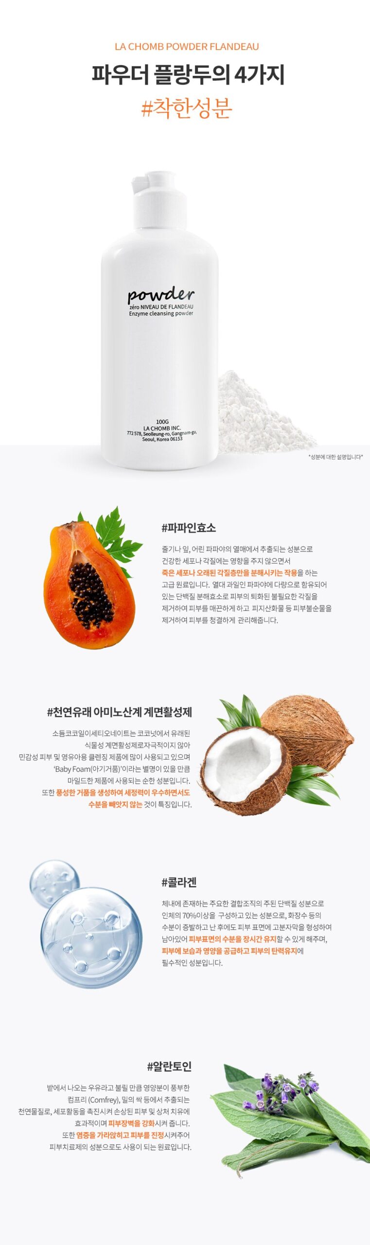 Ingredients extracted from stems, leaves, and young papaya fruits It is a high-quality raw material that works to break down only dead cells or old stratum corneum without affecting healthy cells or dead skin cells. It is a proteolytic enzyme contained in a large amount in papaya, a tropical fruit, which removes degenerated and unnecessary dead skin cells to make the skin smooth, and removes skin impurities such as sebum oxide to keep the skin clean.