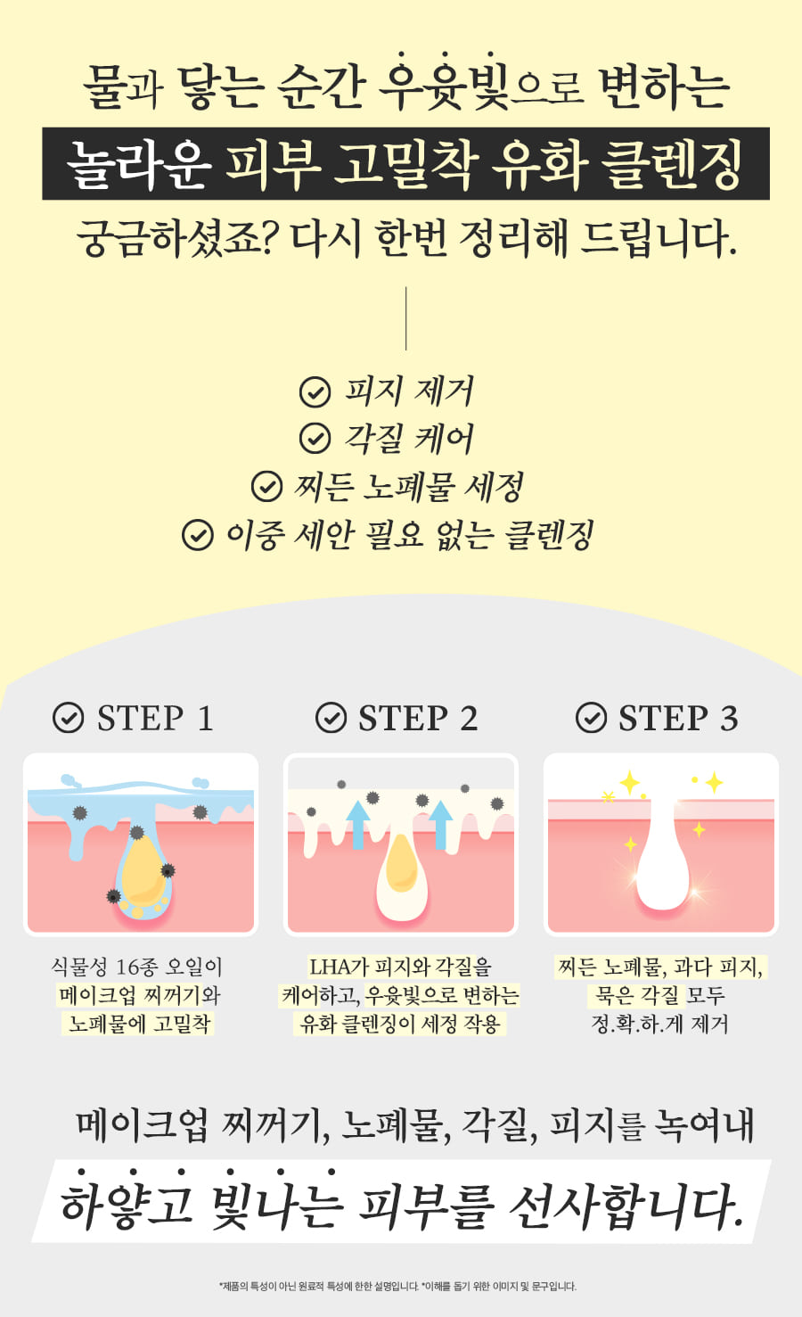 – Lipophilic ingredients dissolve sebum to smooth rough skin and remove dead skin cells accumulated deep in the skin.