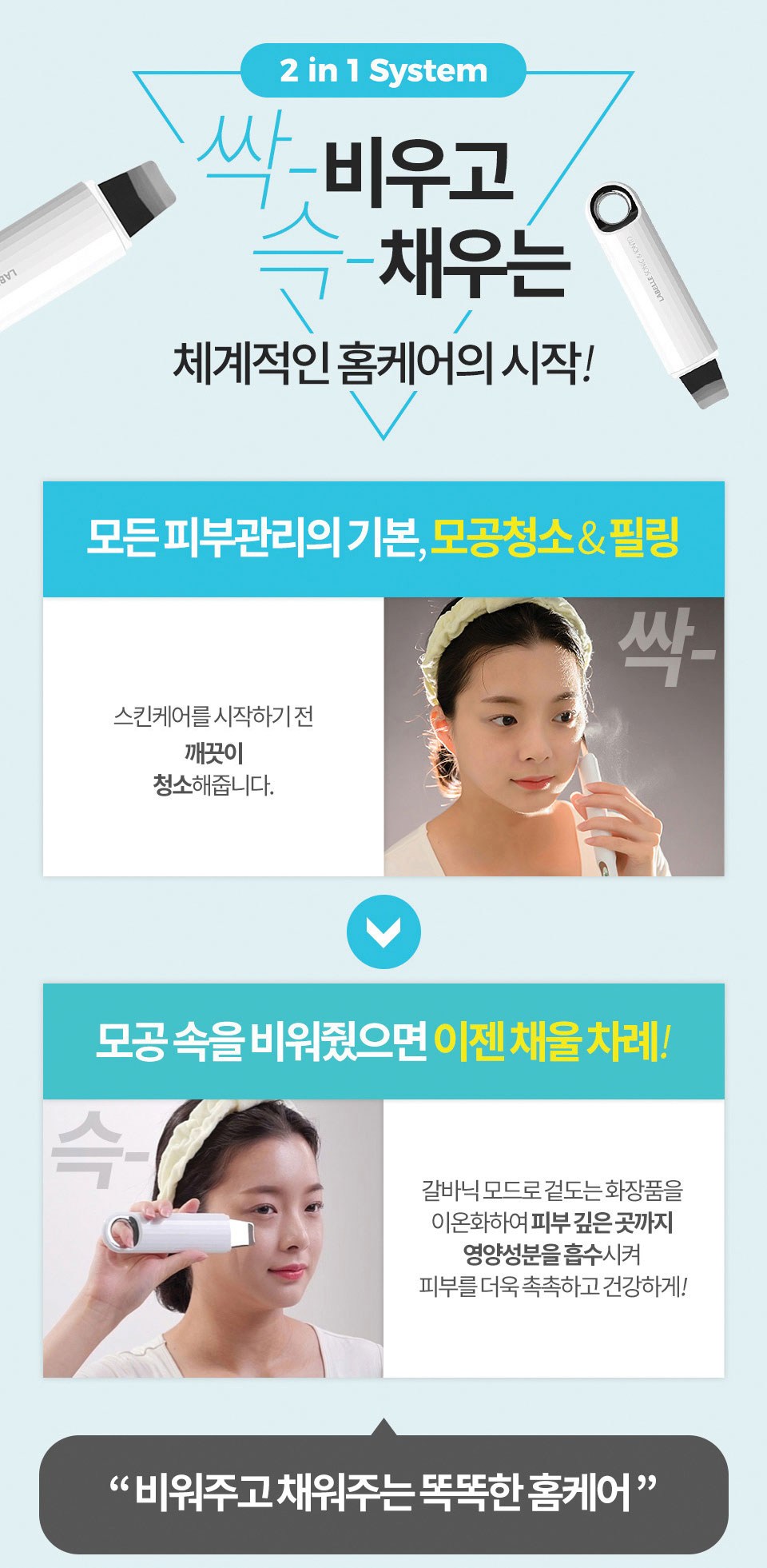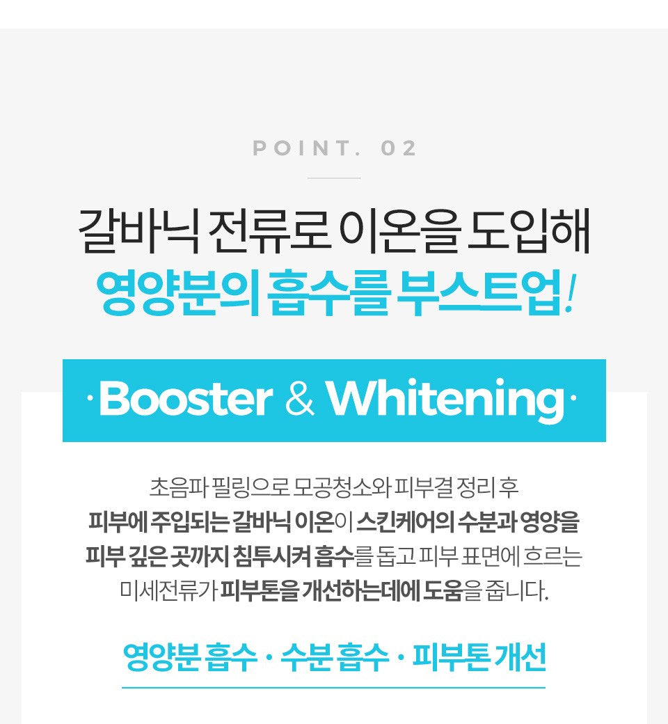 After cleaning pores and organizing skin texture with ultrasonic peeling, galvanic ions injected into the skin penetrate deep into the skin with moisture and nutrients from skin care, helping absorption, and the microcurrent flowing on the skin surface helps improve skin tone.