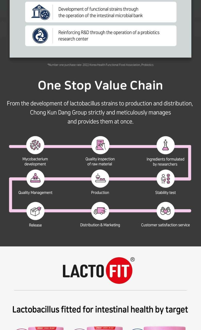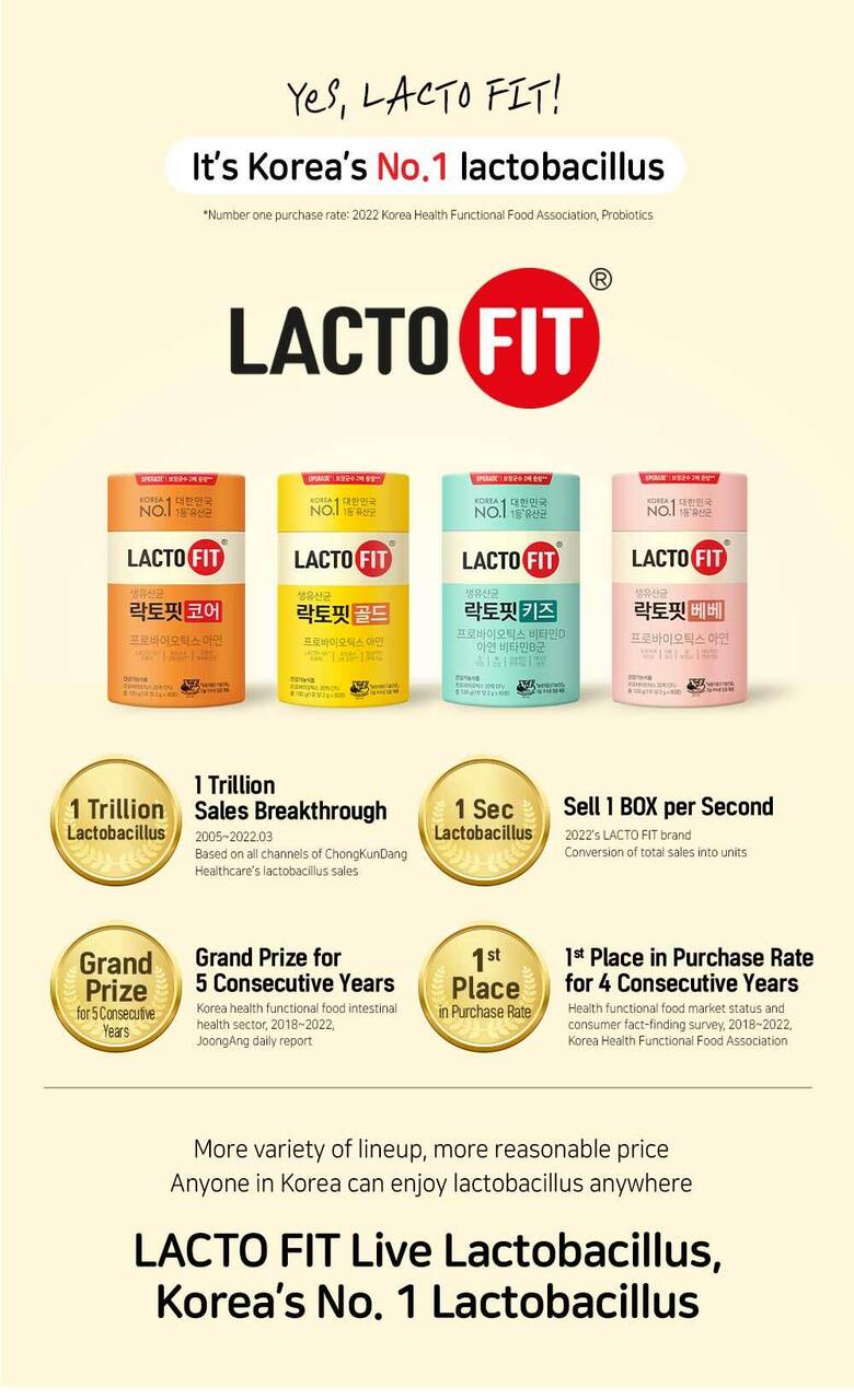 - Korea’s No. 1 Probiotic: LACTO-FIT has surpassed 1 trillion sales, sells one bottle every second, and has won the grand prize for four consecutive years.