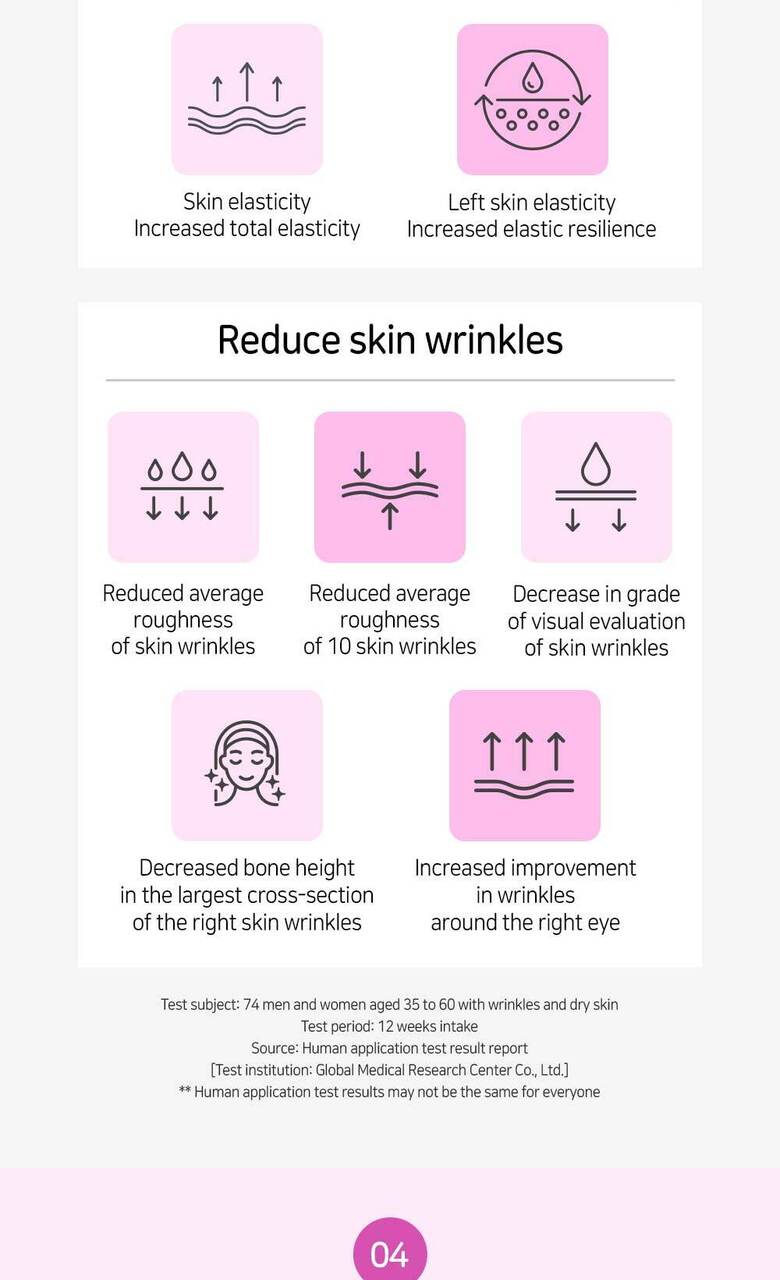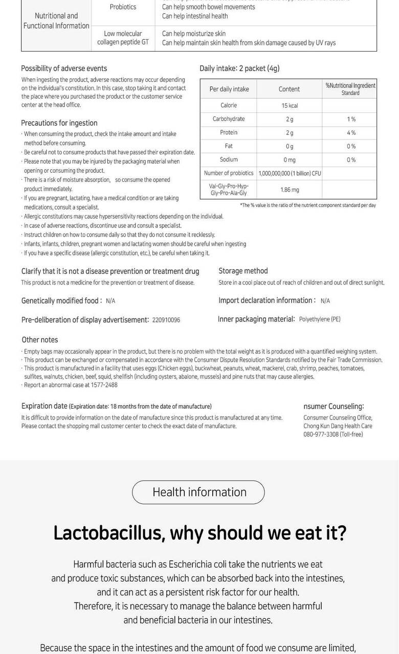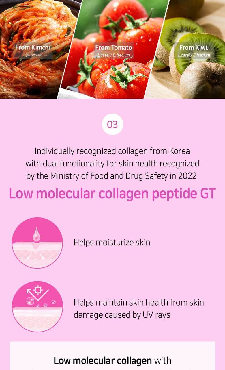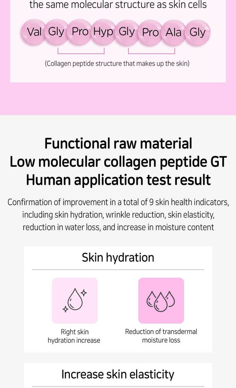 - Functional Ingredient: The product includes low molecular weight collagen peptide GT, recognized by the Ministry of Food and Drug Safety for its skin moisturizing and UV protection properties.