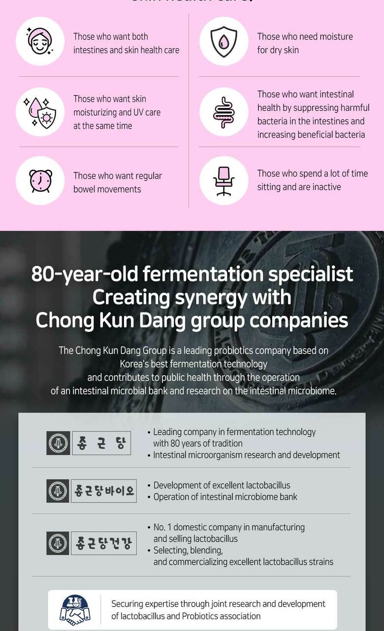 Chong Kun Dang Group, a leading probiotics company in Korea, known for its advanced fermentation technology and dedication to national health through extensive research and strict quality management of lactobacillus development, production, and distribution.