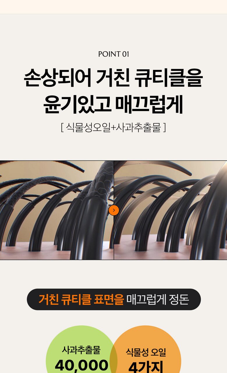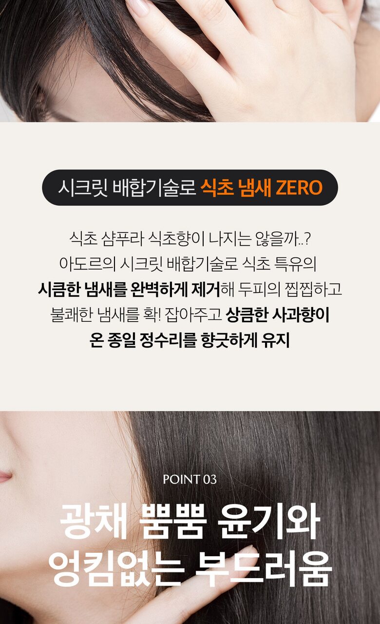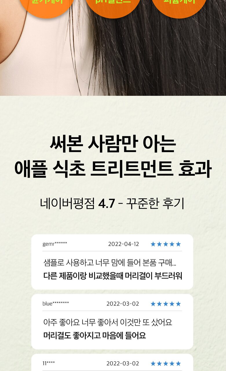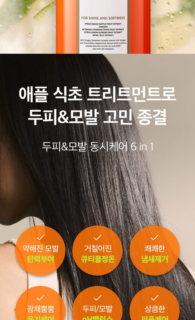 Damaged hair by dyeing/perm, for tangled and split hair with rough cuticles, 4 kinds of vegetable oil + apple vinegar + apple extract smooth the cuticle surface and prevent hair from drying out.