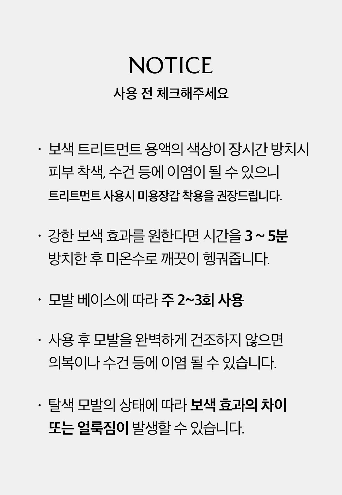 · If the color of the complementary color treatment solution is left on for a long period of time, it may cause skin pigmentation, towel marks, etc., so it is recommended to wear cosmetic gloves during the procedure.