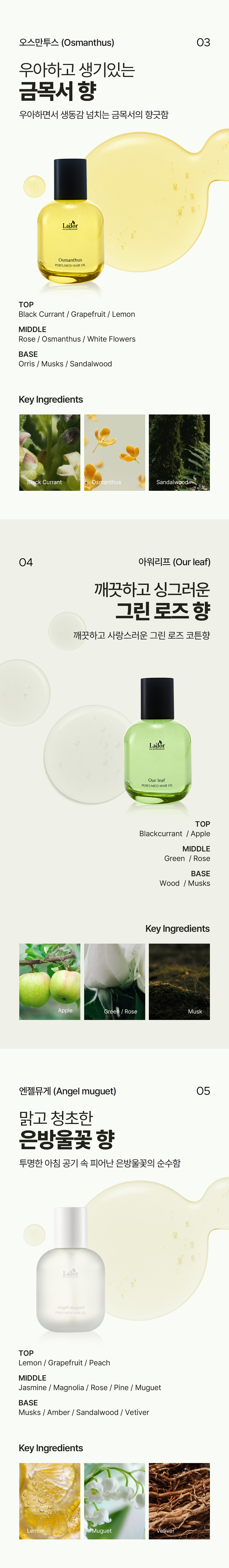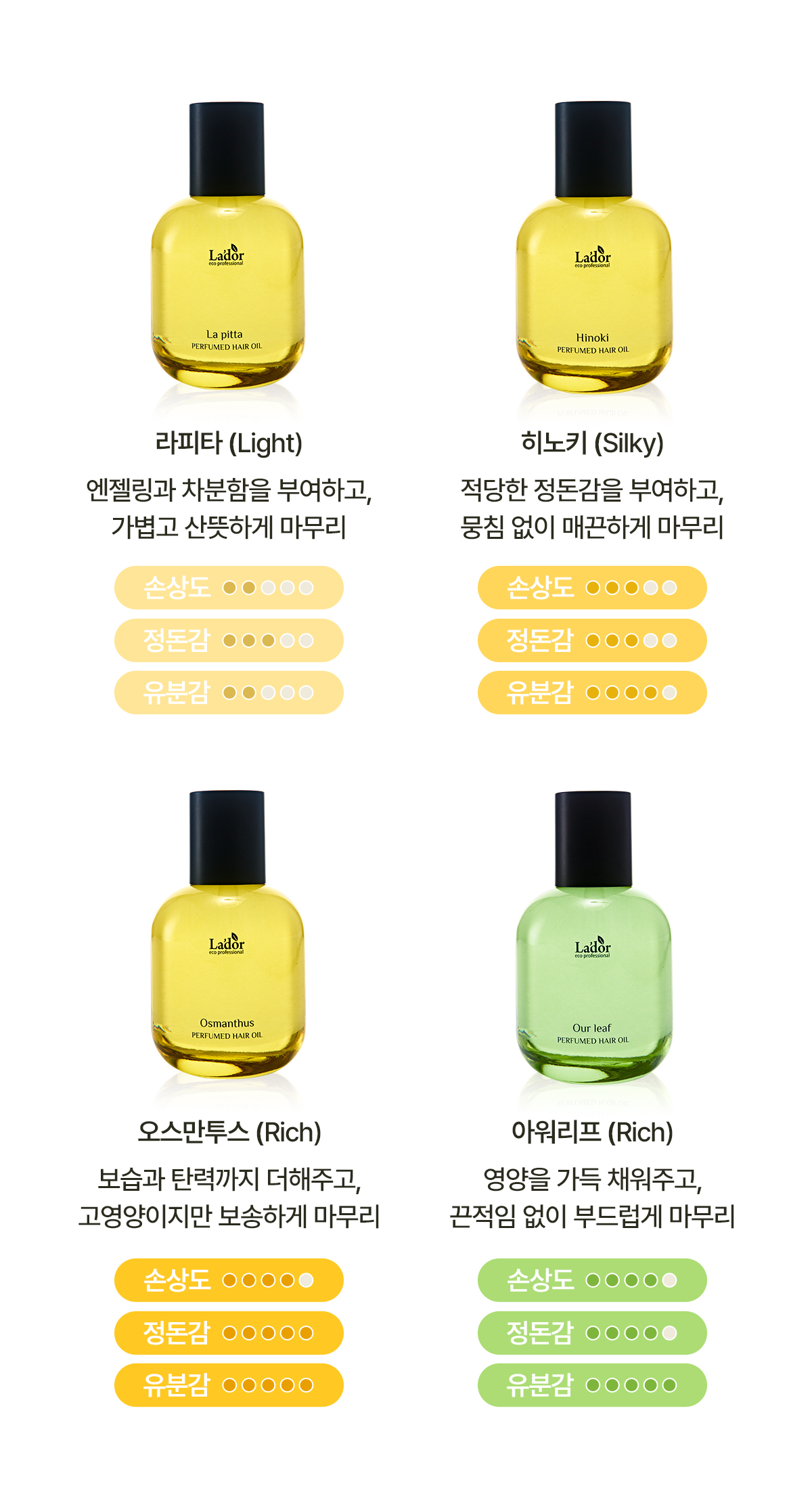 LADOR offers a personalized hair care experience. Choose the perfect perfume hair oil tailored to your hair type, desired finish, and preferred fragrance. Each variant is crafted to address specific concerns while imparting a unique, delightful scent.