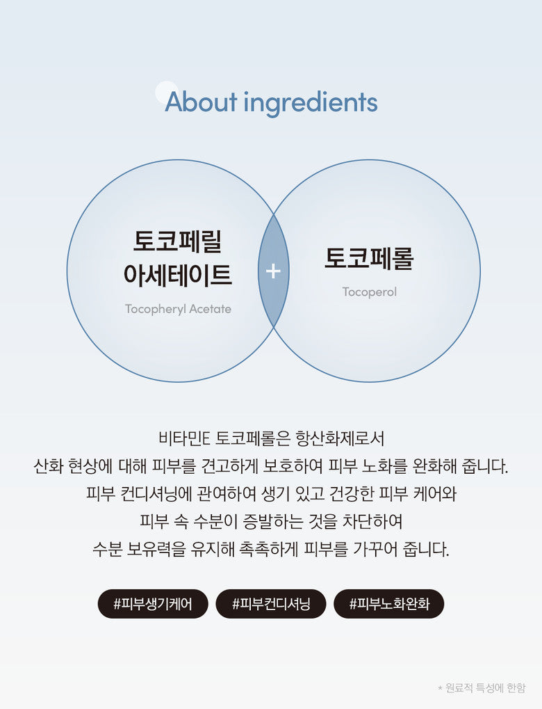 - Tocopheryl Acetate + Tocopherol: These antioxidants help alleviate skin aging and contribute to skin conditioning by blocking moisture evaporation and maintaining moisture retention.