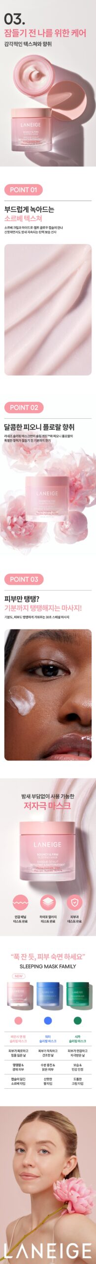 Experience the magic of waking up to rejuvenated, glowing, and visibly firmer skin with LANEIGE Bouncy & Firm Sleeping Mask. Suitable for all skin types.