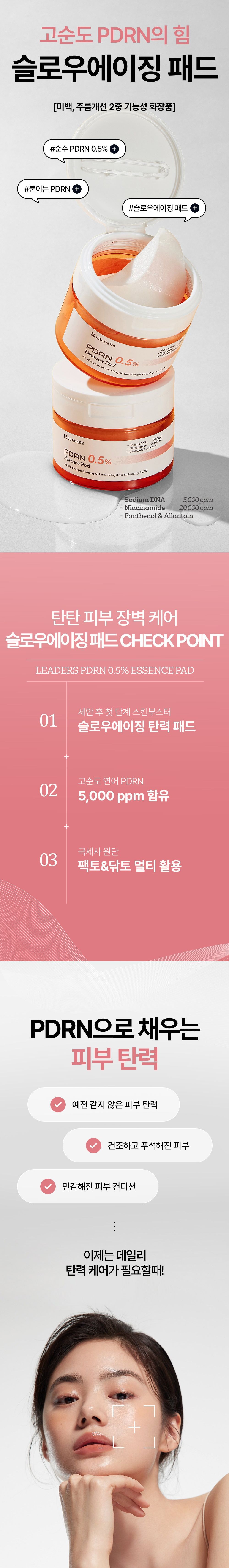 Leaders PDRN 0.5% Essence Toner Pad delivers concentrated Polydeoxyribonucleotide (PDRN) derived from salmon DNA in convenient pad form. This innovative toner pad provides intense skin regeneration, anti-aging benefits, and deep hydration with each use.