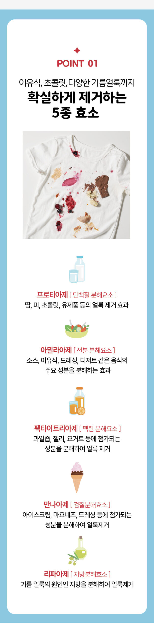 Protease: Dissolves protein-based stains like sweat, blood, chocolate, and dairy.