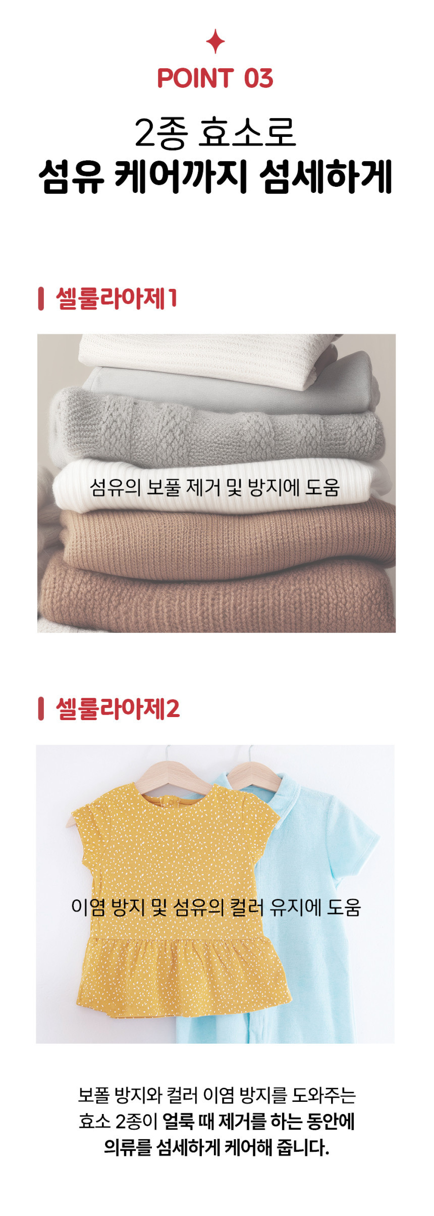 AVCA doesn’t just remove stains—it protects your clothes too. Two specialized cellulase enzymes are included to:
