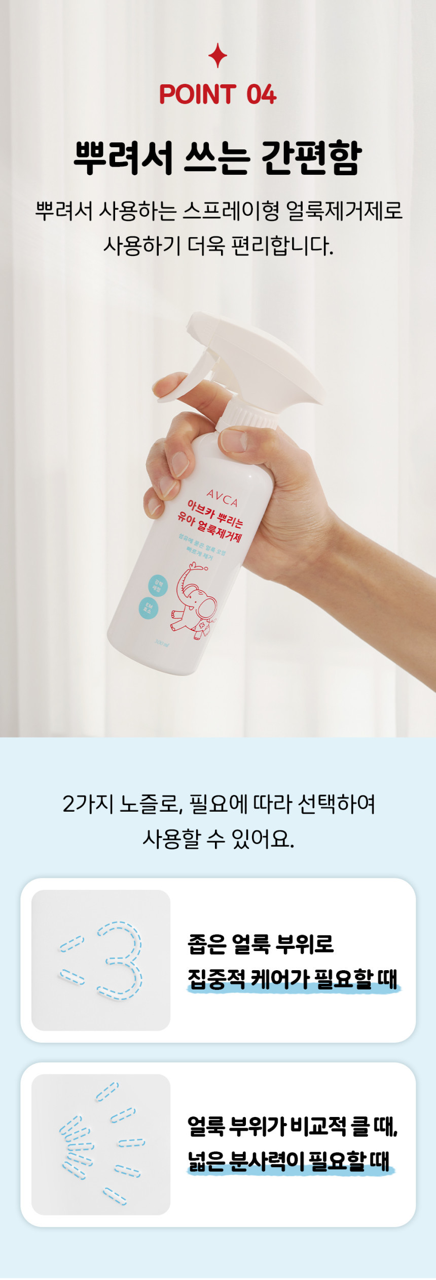 Designed for convenience, the AVCA stain remover features a dual-spray nozzle. Choose between a targeted stream for small spots or a wider spray for larger stains. Whether it’s baby food, makeup, or tough outdoor dirt, application is quick and mess-free.
