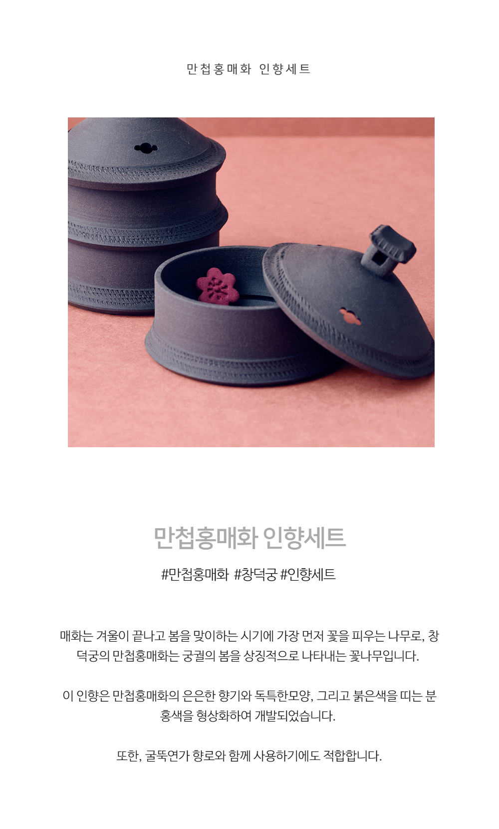 Celebrate the timeless beauty of spring with the K-Heritage Mancheop Red Plum Blossom Incense Set, inspired by the iconic red plum blossoms of Changdeokgung Palace. Known as the first bloom to welcome spring, the Mancheop Red Plum Blossom symbolizes seasonal renewal and cultural heritage in Korea.