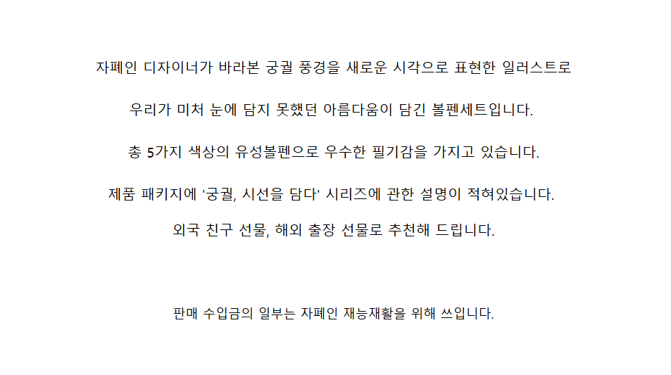 This thoughtfully crafted pen set captures the elegance and charm of traditional Korean architecture from a perspective rarely seen. Each pen showcases a different view of a palace, inviting users to discover the subtle details often overlooked.