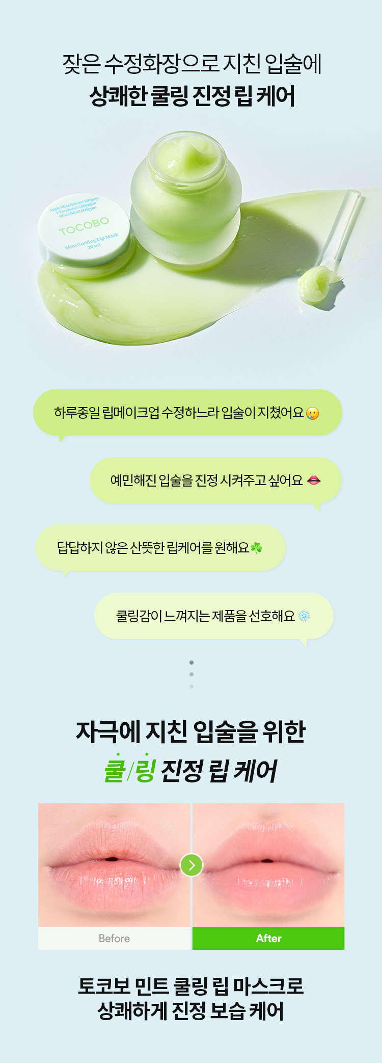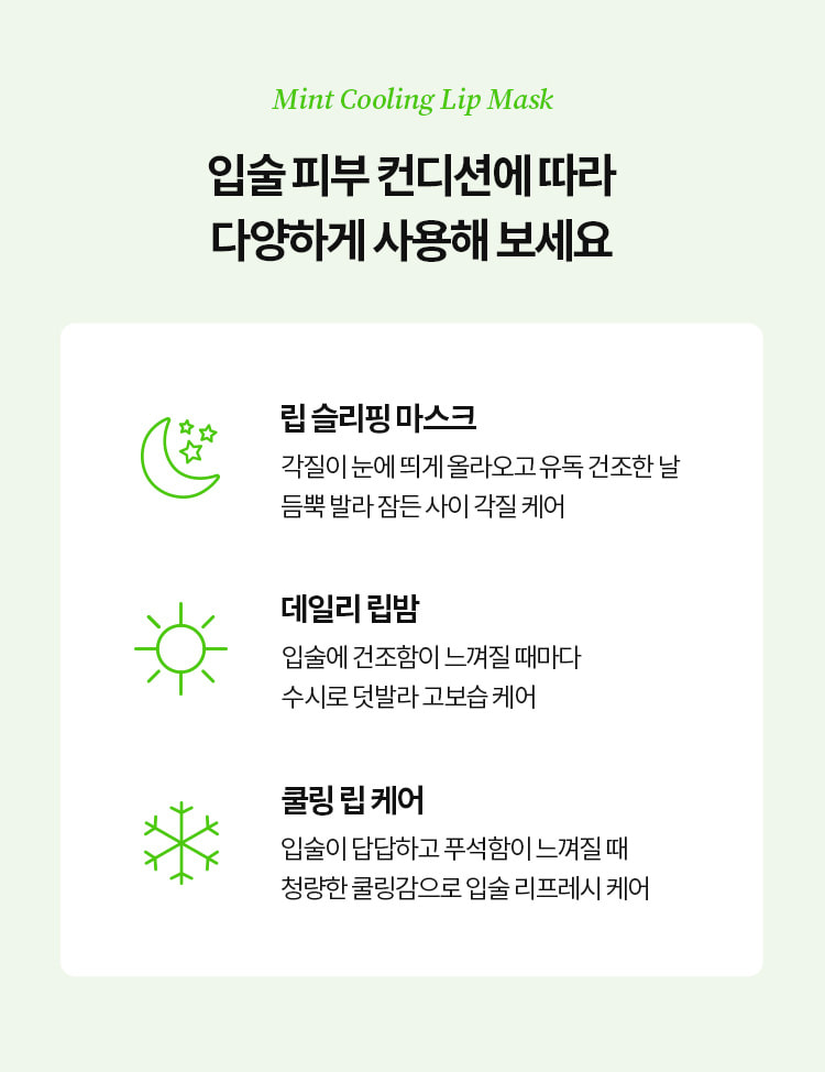 Use a thin layer throughout the day whenever lips feel dry, providing continuous moisture and a refreshing cooling effect. - Cooling Lip Care