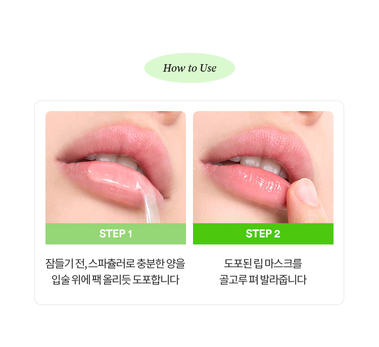 Apply a generous amount to lips with a spatula before bed, covering lips as if applying a pack. This helps care for dead skin cells and deeply hydrates while you sleep. -