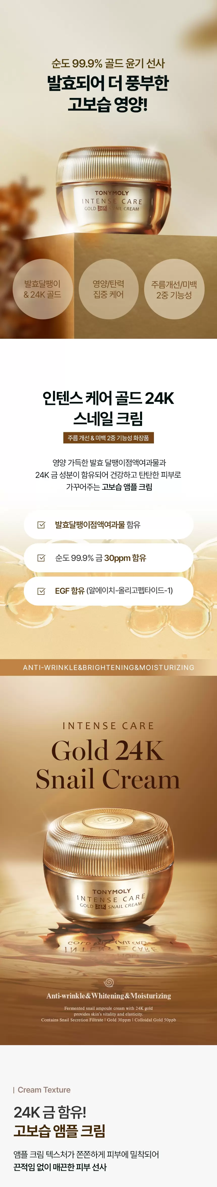 Each ingredient in the TONYMOLY Intense Care Gold 24K Snail Cream is carefully selected to ensure maximum efficacy and deliver a luxurious experience: