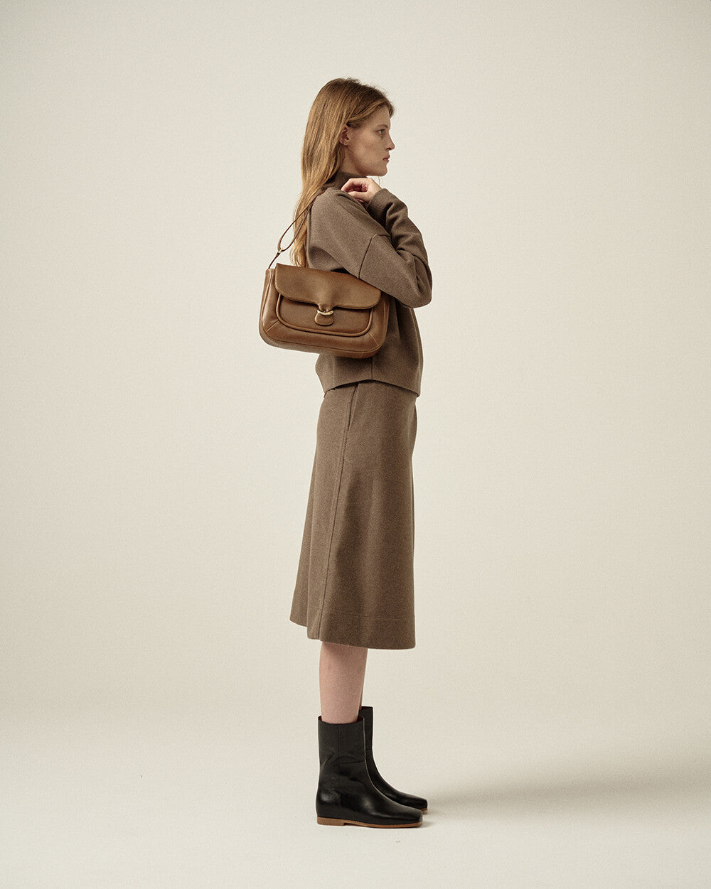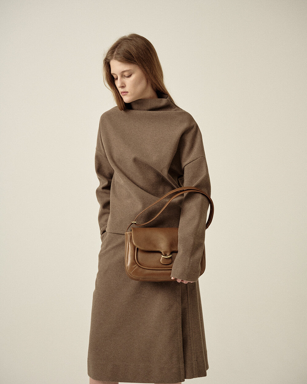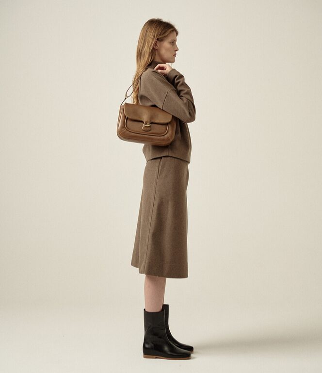 This exquisite shoulder bag reinterprets the classic mailbag, designed to resemble a postal envelope used to deliver heartfelt messages and important news. With its minimalist aesthetic, it embodies the essence of a silent messenger, conveying precious emotions through its refined details.
