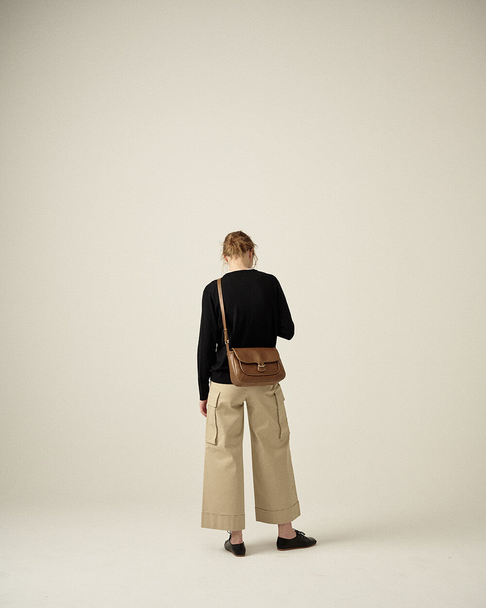 Crafted from soft yet durable cowhide, this bag offers a sturdy structure while remaining gentle against the body. The irregular metal decoration, engraved with the brand logo, enhances its sophisticated appeal.