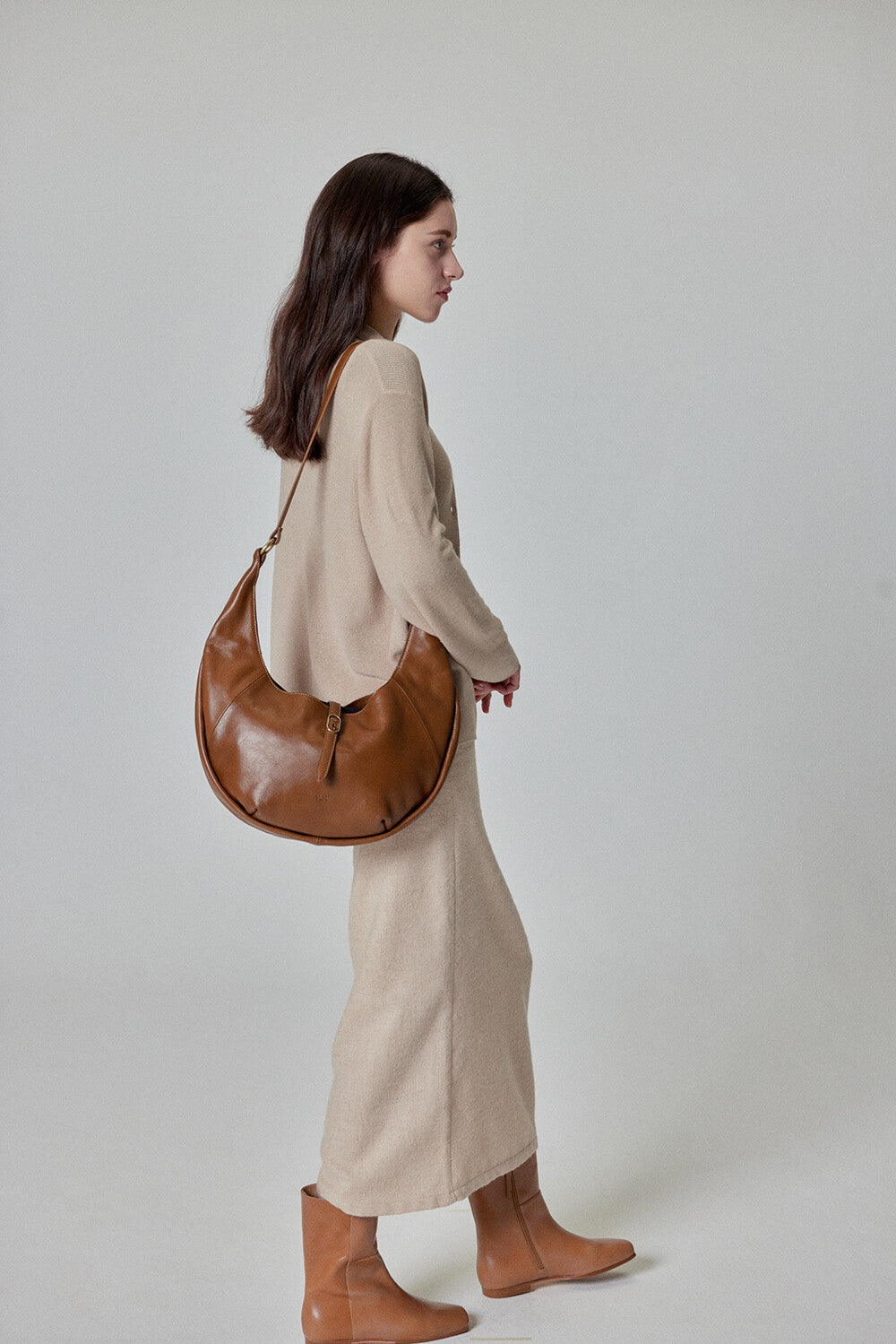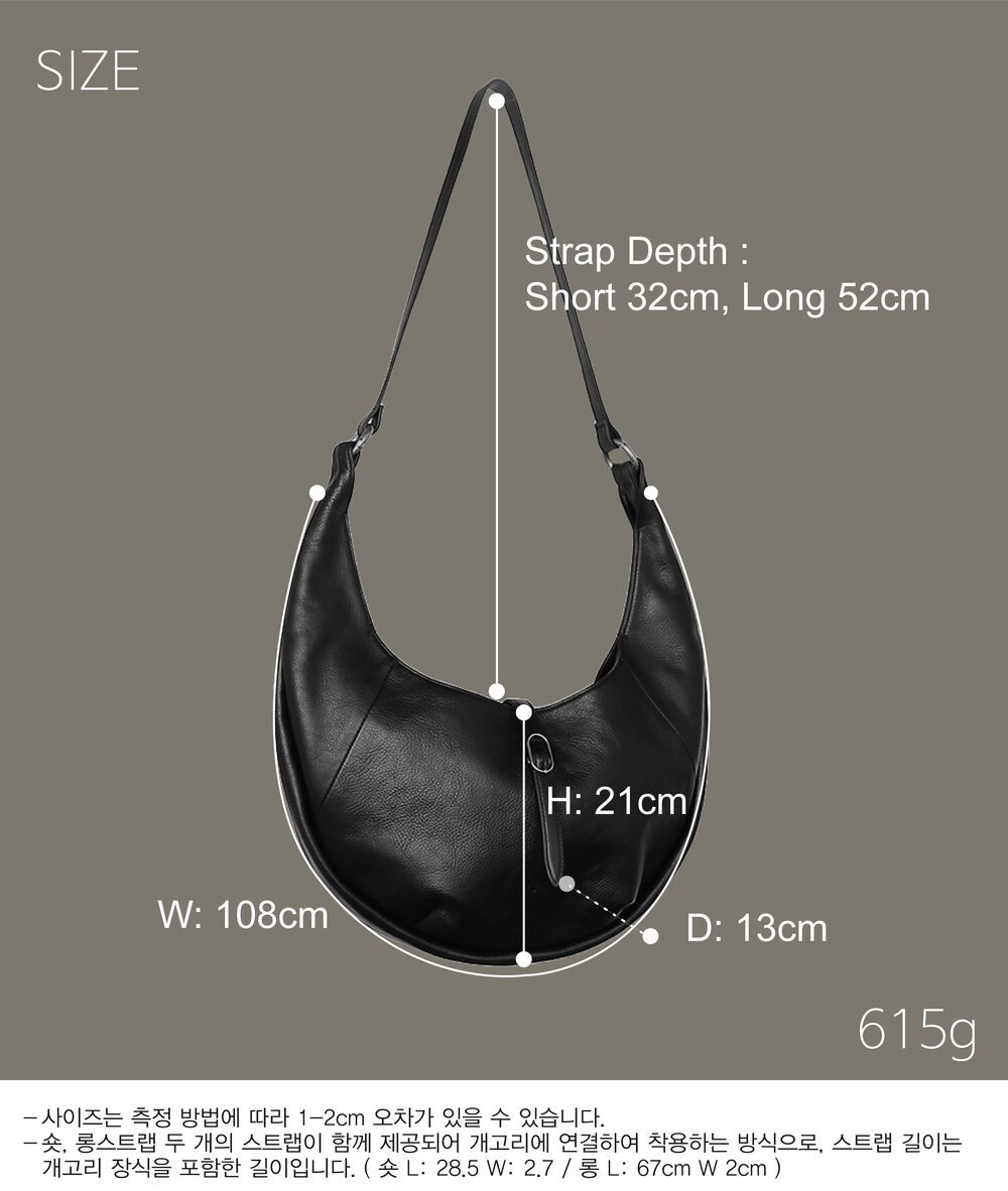 This stylish hobo bag features a crescent-shaped silhouette, crafted with precision through expertly placed darts on soft cowhide leather. Its bold decorative accents add a touch of sophistication, making it a statement piece for any outfit.