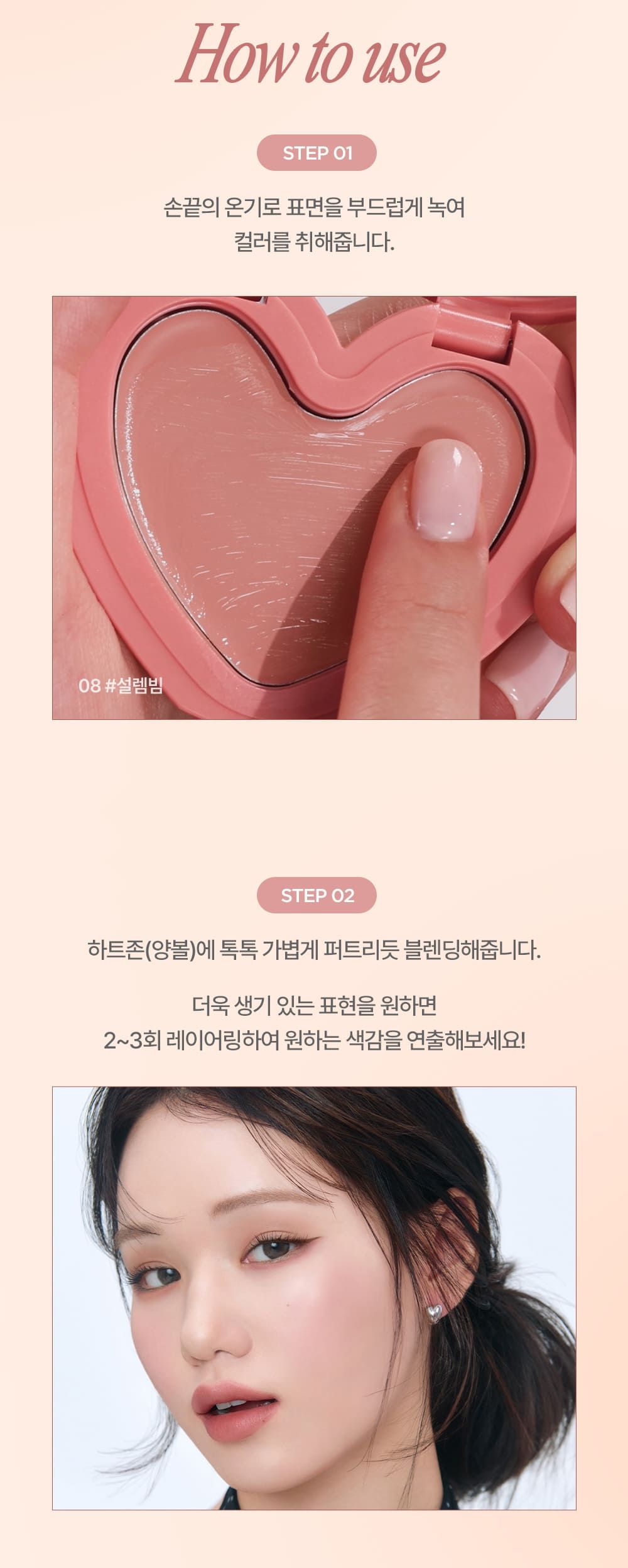 A heart-shaped balm blush that melts into your skin at body temperature for a natural, healthy glow. This cream-type cheek balm delivers buildable color that blends seamlessly without emphasizing pores or fine lines.