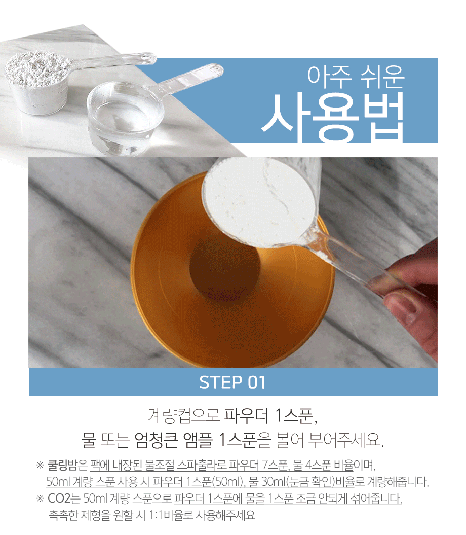 - Mixing: Combine 1 spoon (50ml) of pack powder with slightly less than 1 spoon of water. For a more moist formulation, mix in a 1:1 ratio.