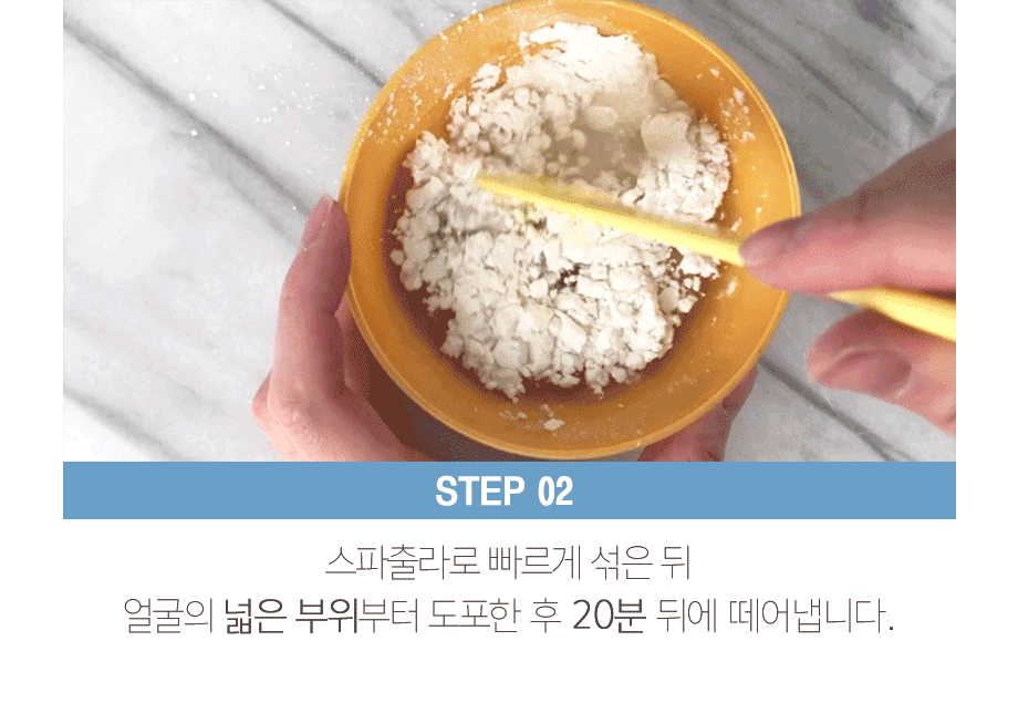 - Application: Quickly mix with a spatula, apply generously to the face, and leave for 20 minutes.