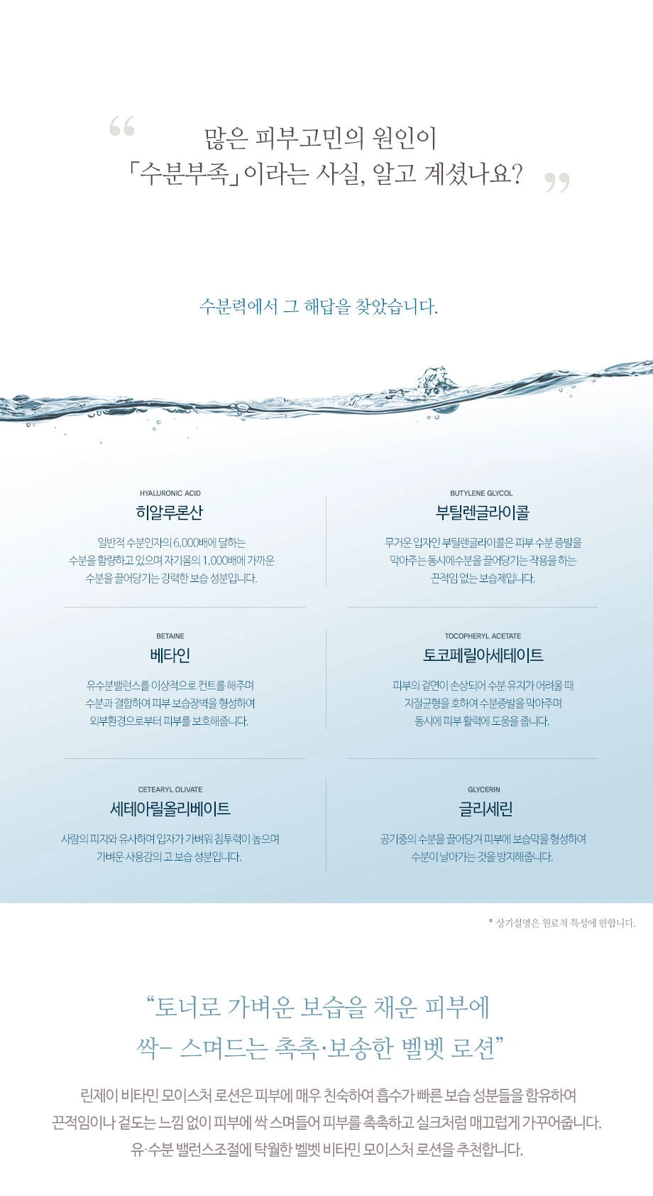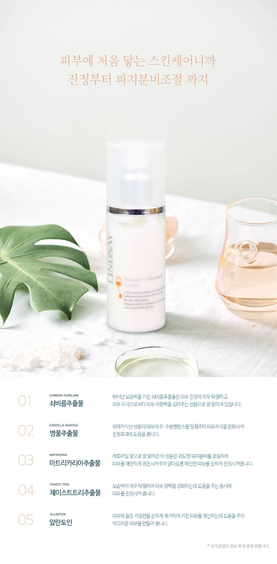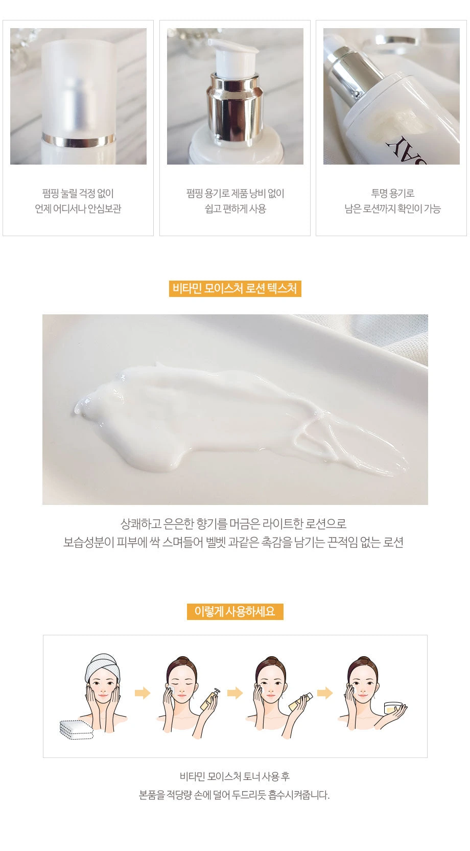 Texture and Usage of Vitamin Moisture Lotion Enjoy the light, refreshing scent and the non-sticky, velvet-like texture that leaves your skin feeling moisturized and smooth. After using the Vitamin Moisture Toner, apply an appropriate amount of lotion and gently pat for absorption.