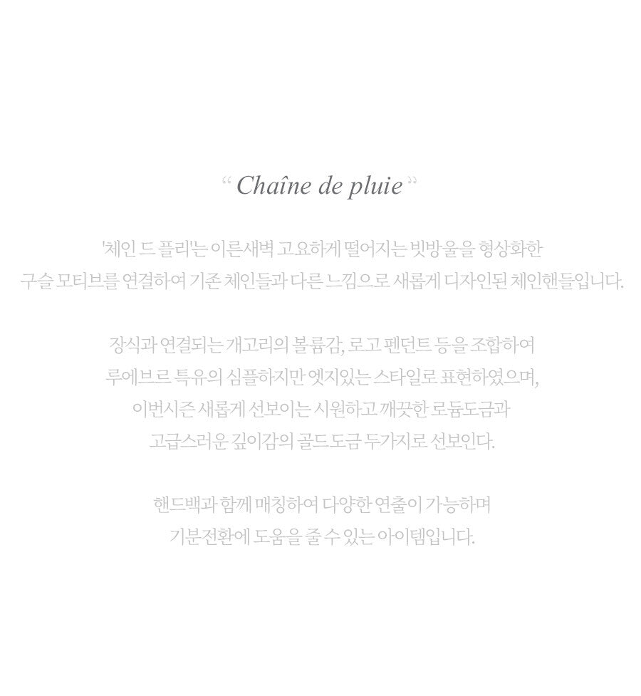 The ‘Chain of Raindrop’ is an innovative chain handle, distinct from traditional designs. It features a bead motif reminiscent of quiet raindrops falling in the early morning. This handle combines the volume of a dog ring with a logo pendant, showcasing the Louvre’s signature style — simplistic yet edgy.