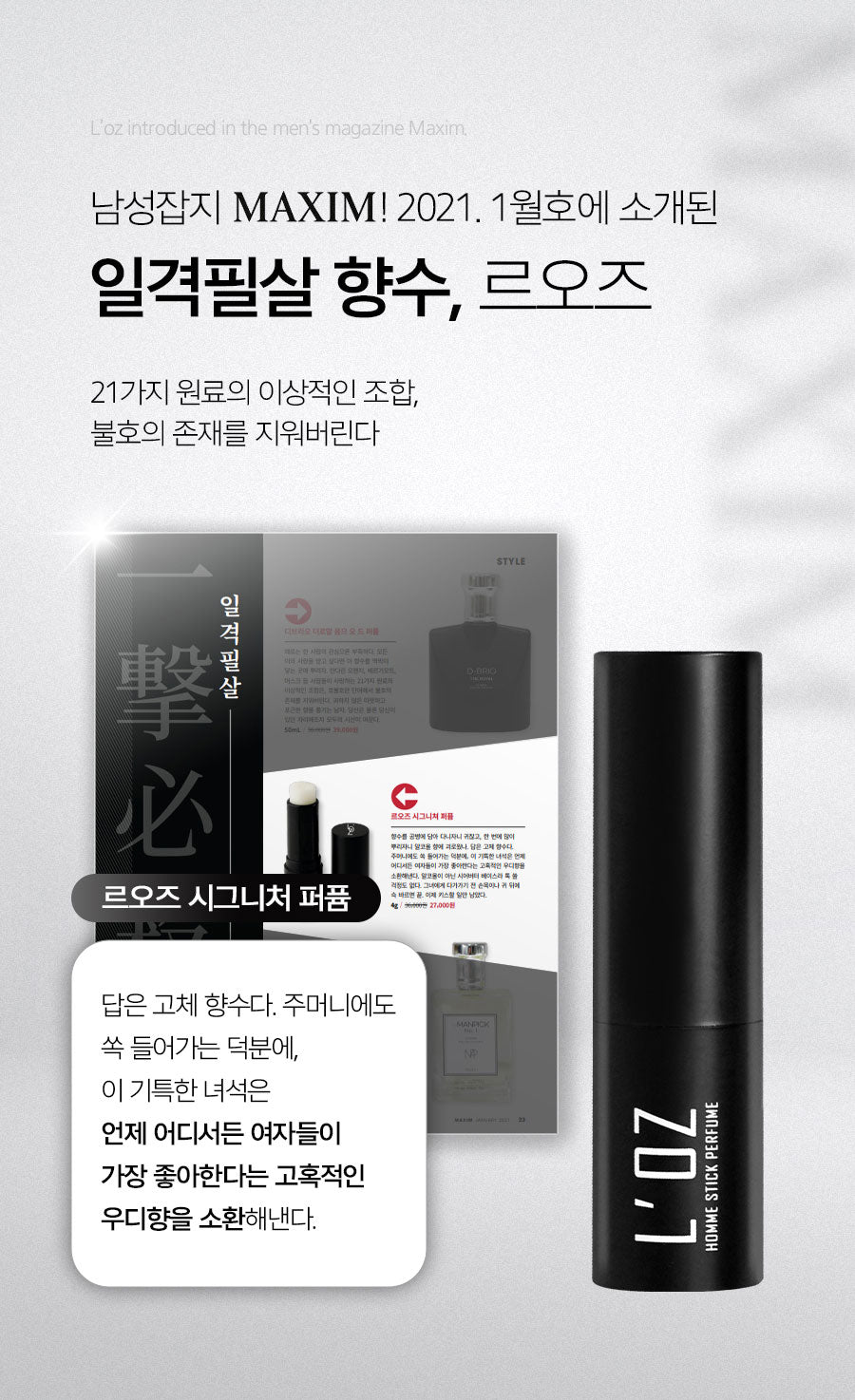 Wrapped in the elegance of pine and cedarwood, L’OZ SIGNATURE exudes an appealing masculinity. It’s subtle enough for a midday coffee chat yet distinctive during night outings, eliciting nods from those around you.