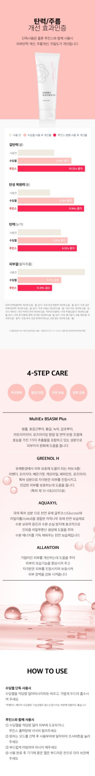 Rubellad Soothing Gel contains active ingredients that help whitening and wrinkle improvement. When used with Lucins, the active ingredients are delivered deep into the skin, helping to improve wrinkles and skin whitening.