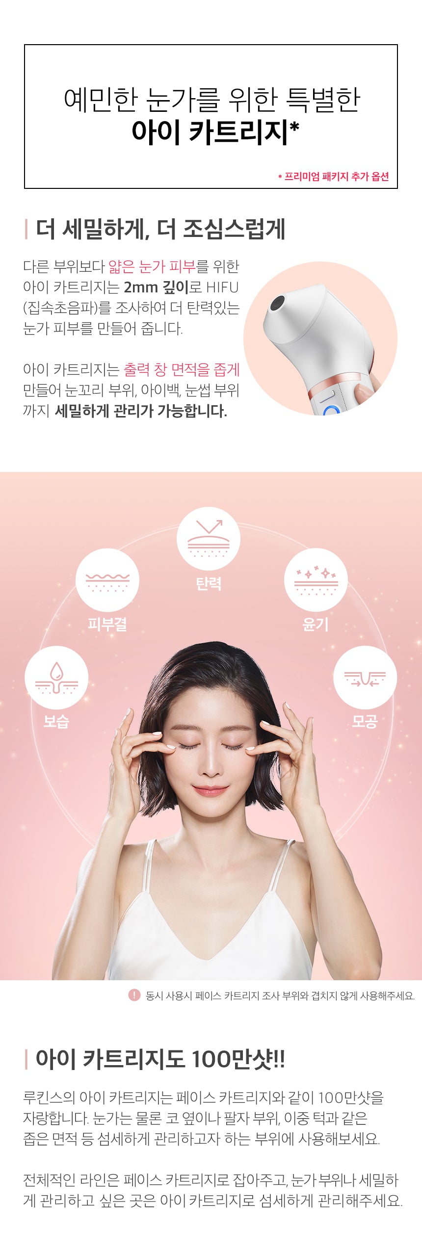 The eye cartridge for the skin around the eyes, which is thinner than other areas, irradiates HIFU (focused ultrasound) at a depth of 2mm to create more elastic skin around the eyes.